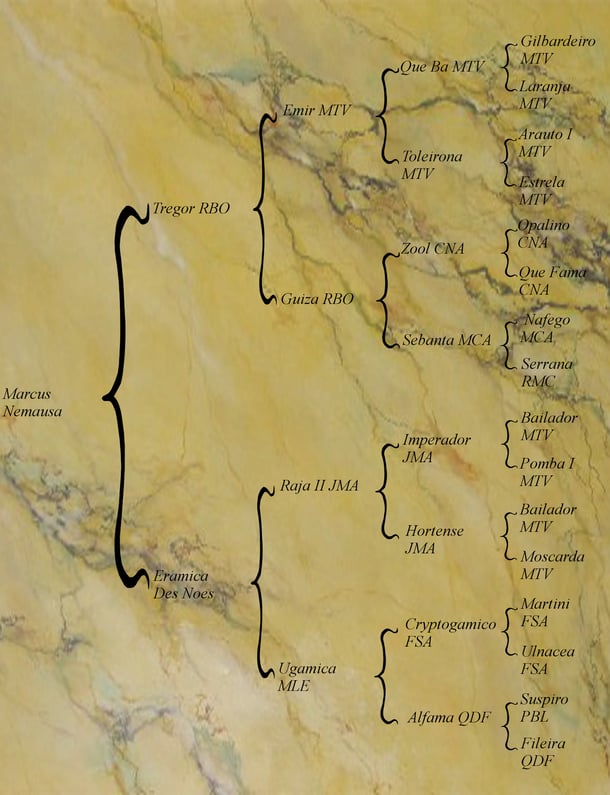 Tregor, Odin, Spartacus, Orphee et Scapin ont pour même père le fameux EMIR MTV (grand père de Marcus), étalon Veiga a l'excellente production de chez Manuel Tavares Veiga. Vous trouverez également plusieurs autres pur Veiga dans les lignées de Marcus, entre autres :