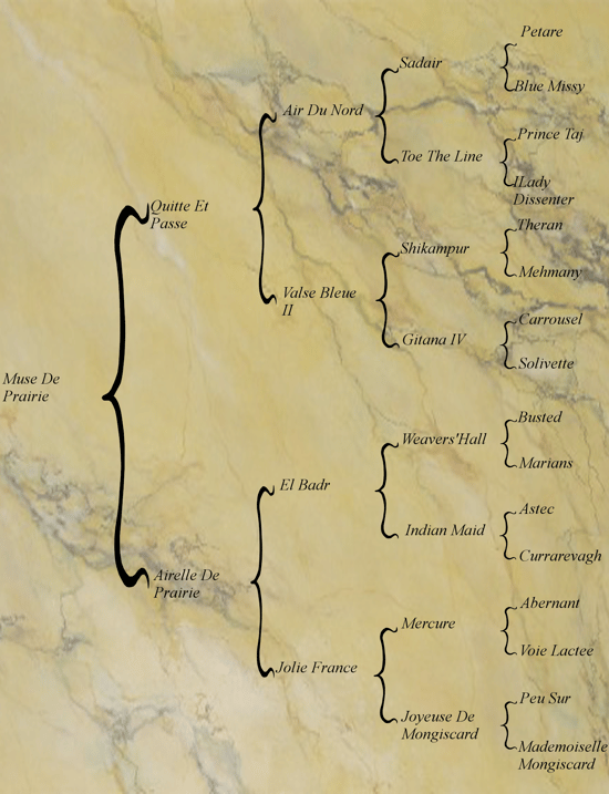 Fille du Selle Français Quitte et Passe (cheval de course d'obstacles à l'ICO 127), celui ci produisit de nombreux chevaux (demi frère et sœurs de Muse), qui ont sut se démarquer dans divers disciplines.